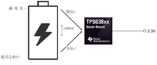 例如,假設要使一個典型電壓范圍為4.2V到2.8V的鋰離子電池提供3.3V的輸出電壓,如果使用降壓轉換器,那么電池的截止電壓必須大于3.3V,缺點則是無法有效利用電池中存儲的電能。而降壓-升壓轉換器有助于充分利用電池的所有電能,因為當輸入電壓等于或低于3.3V時,降壓-升壓轉換器還可以消耗存儲的電能,如圖2所示。