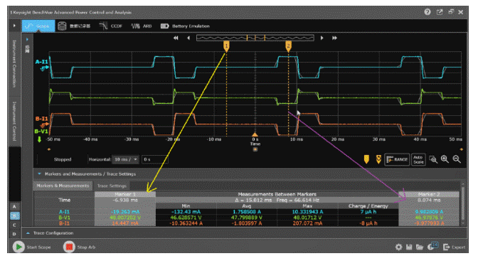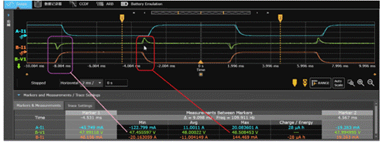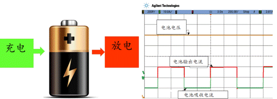 如下圖所示,我們利用APS電源拉載脈沖電流,同時利用其200KSa/s(18bit)高速采樣能力監測電池的端電壓,可以看到其變化呈現3個不同階段。