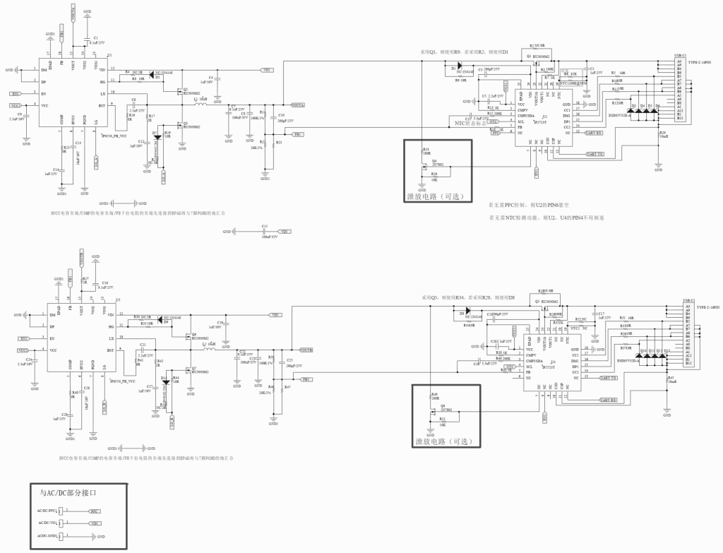 此款方案雙路均采用IP2723T搭配IP6550,通過雙路IP2723T之間的12/13腳進行URAT通訊,來相互傳輸每個口的狀態信息,可以實現用C1口的IP2723T來控制PFC電路。