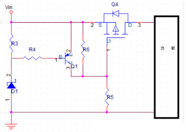 Vin正常輸入電壓時,穩壓管沒有反向擊穿,R3,R4電流基本為0。PNP三極管的Vbe=0,即PNP三極管不導通。PMOS管Q4的Vgs由電阻R5,R6分壓決定,PMOS管導通,即電源正常工作。