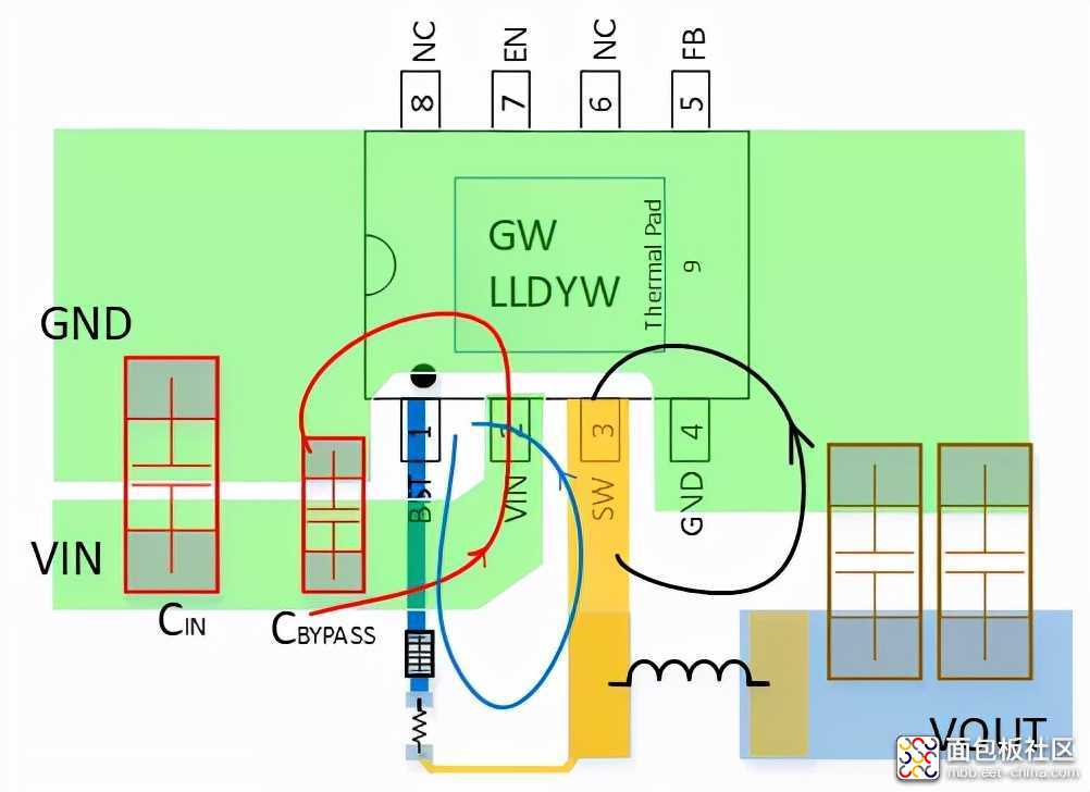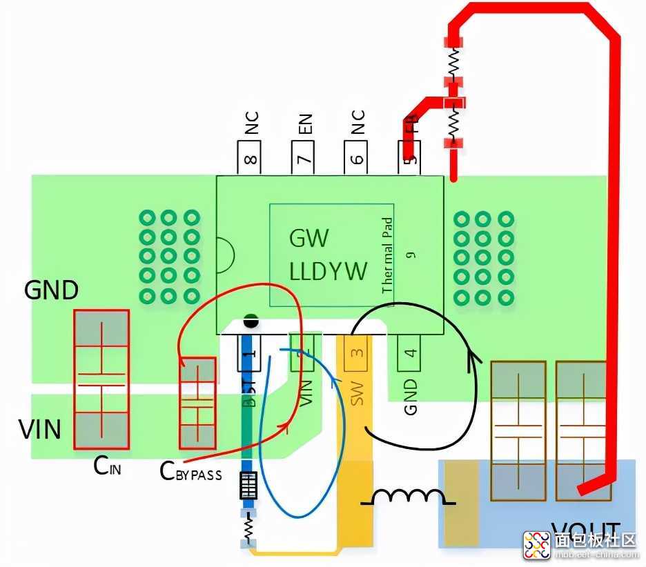 - 對于BUCK芯片而言,要想使輸入環路盡可能小,電感要靠近芯片SW引腳放置