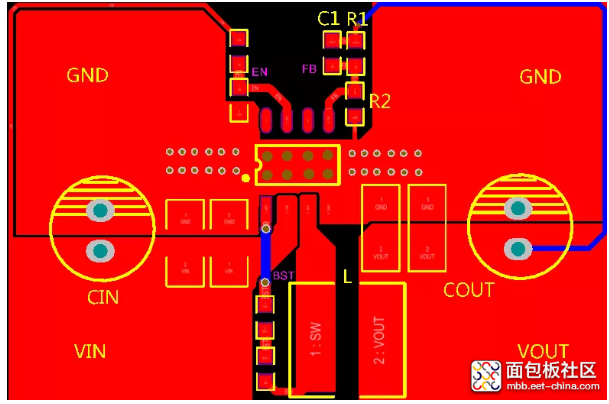 - FB的分壓電阻要從VOUT上進行采樣,采樣點要靠近輸出電容處才能獲得更準確的實際輸出電壓值
