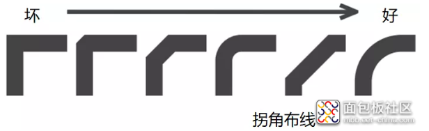 - 如果將拐角布線彎成直角,轉角處的阻抗就會發生變化