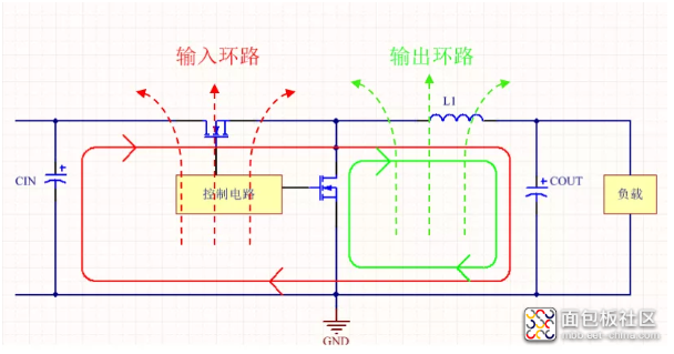 DC-DC芯片布板需遵循一個非常重要的原則,即開關大電流環路面積盡可能小。下圖所示的BUCK拓補結構中可以看到芯片開關過程中存在兩個大電流環路。紅色為輸入環路,綠色為輸出環路。每一個電流環都可看作是一個環路天線,會對外輻射能量,引起EMI問題,輻射的大小與環路面積呈正比。