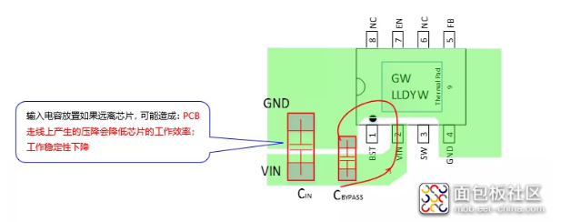 - 對于BUCK芯片而言,要想使輸入環路盡可能小,輸入電容應盡可能靠近芯片引腳放置