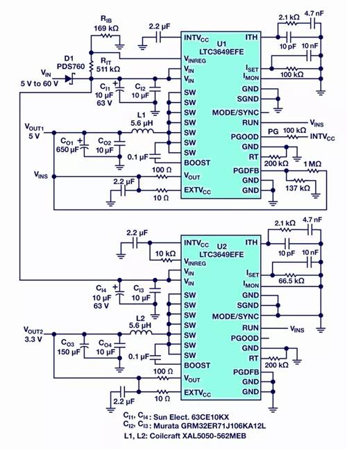 圖1顯示采用LTC3649的保持設計。在正常情況下,未調節的電壓軌 VIN (VINS 通過阻塞二極管)為基于U1的轉換器(轉換器A)供電。該轉換器以降壓模式工作,在 VOUT1上產生穩定的5 V電壓。VINS連接到基于U2的第二個轉換器(轉換器B),它在 VOUT2上為關鍵負載供應3.3 V電壓。VIN發生故障時,轉換器A進入升壓模式并通過對其輸出濾波電容器C01和 C02放電來維持其設定的輸出電壓VINS。電阻 RIT和 RIB設定此電壓電平。由U1產生的PGOOD(PG)信號可用于將電源故障傳遞給系統,從而斷開非關鍵電路以保持能量。MODE/SYNC引腳將懸空,以允許LTC3649進入升壓模式。