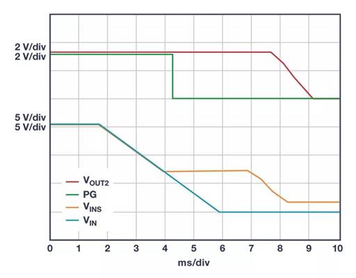 圖2. 當輸入電壓 VIN下降時,轉換器U1對 VOUT1 進行升壓以將 VINS維持在8 V。在 VINS降壓后,VIN 供電以使 VOUT2 保持穩定超過20 ms。