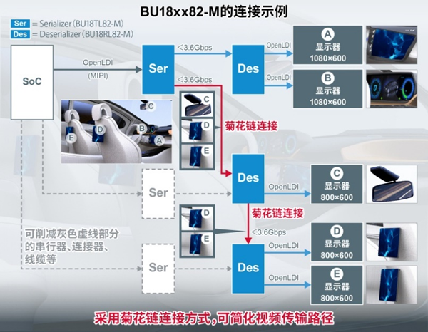 ROHM開發出可簡化視頻傳輸路徑的、用于車載多屏顯示器的串行/解串器"BU18xx82-M"