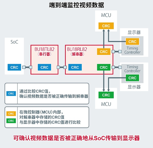 普通的SerDes IC需要成對連接串行器和解串器才能傳輸視頻,而ROHM的新產品,可以用菊花鏈方式連接解串器“BU18RL82-M”,因此可通過單個串行器將視頻傳輸給多個路徑。由于可以減少連接器和線纜的數量,因此可以簡化視頻傳輸路徑,從而有助于降低應用產品的系統成本和故障風險。此外,新產品作為支持全高清分辨率的SerDes IC,具有通過比較CRC*2值來端到端*3(從SoC到顯示器)監控視頻數據是否已被正確傳輸的功能,有助于提高應用產品的功能安全。