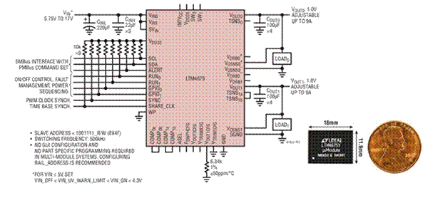 所述LTM4675是雙9A或單18A降壓微型模塊(微型組件)的DC / DC調節器設有的電力系統管理(PSM)參數上的PMBus-一個開放標準的遠程可配置性和遙測監測余2的基于C的數字接口協議。其6mm x 11.9mm x 3.51mm BGA封裝包含模擬控制回路,精密混合信號電路,EEPROM,功率MOSFET,電感器和支持組件。它具有4.5V至17V的寬輸入電壓范圍,以及0.5V至5.5V的輸出電壓范圍,在整個溫度范圍內具有±0.5%的直流精度。LTM4675的功率輸出可以通過數字調節,裕量調節并以可編程擺率和時序延遲時間進行上電/下電。長開機時間為70毫秒。遙測讀回參數包括VIN,I IN,V OUT,I OUT,溫度,運行峰值,正常運行時間,故障和警告。在9A溫度下,當前讀回精度為±2.5%。