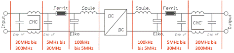 濾波器元件選擇標準中最重要的一點是能實現從 150kHz 至 300MHz 的寬帶干擾抑制,從而抑制傳導和輻射 EMC。如果輸入或輸出使用較短的電纜或不使用電纜,則可以降低濾波程度。圖 6 展示的是各個濾波器元件的有效頻率范圍。