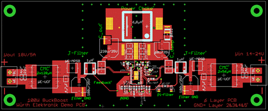 就算進行了非常仔細的布局并選擇了合適的有源和無源元件,如果有額外的非常嚴格的規格要求(如長線纜、不能屏蔽等),那么沒有濾波器就無法實現符合 B 類標準的大功率 DC/DC 轉換器。不過,我們可以預期到并且提前布置合適的濾波器。得到的結果是一個靈活、高效、符合 B 類標準的 100W 降壓升壓轉換器。為了讓印制電路板更緊湊,兩個濾波器可以旋轉 90° 或布置在電路板的反面。REDEXPERT 和 LTSpice 等設計和仿真軟件有助于快速且經濟高效地達到預期設計目標。