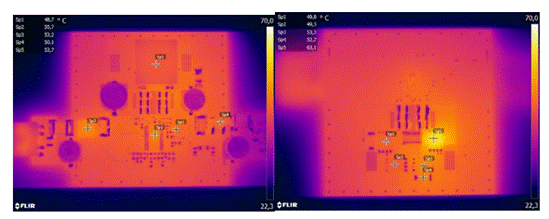 使用熱像儀測得元件最高溫度低于 64℃(圖 8),這意味著有足夠的安全裕度來應對較高的環境溫度,同時對元器件的壓力也較小。效率也處于非常高的水平(降壓模式:96.5%;升壓模式:95.6%),特別是考慮到所有的濾波器元件都已計算在內。