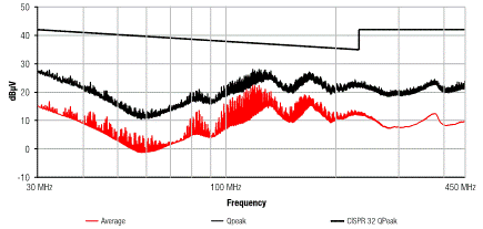 圖10:在輸入端帶濾波器的測量傳導發射。平均值和準峰值在整個測量范圍內均低于限值。