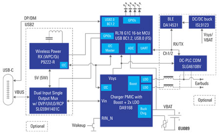 方案中使用的PMIC是瑞薩旗下可配置的單芯片電源管理IC DA9168,其集成的雙LDO和反向升壓功能,可支持USB On-The-Go(USB-OTG)標準。此外,該PMIC芯片在非常緊湊的體積內實現了極低的靜態電流消耗,這使其非常適用于眾多注重空間的、電池供電的消費類應用。不僅如此,得益于DA9168的多種省電模式,使得產品無論是閑置存放還是在運行中,都可以延長電池壽命。在供電設計方面,方案可通過USB連接器或單芯片5W無線電源接收器(P9222-R)為該PMIC供電。供電路徑由2:1電源多路復用器(SLG591401C)自動選擇。
