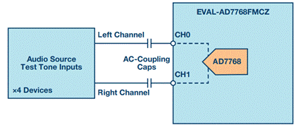 為了探究AD7768/AD7768-4在音頻測試領域的適用性,我們開展了典型音頻測試實驗來展示不同消費音頻設備的性能,以及如何利用AD7768/AD7768-4來測試各種設備。此測試運用AD7768評估板