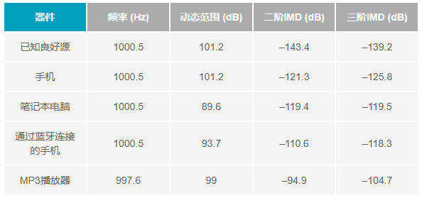 從表1可看出,對于不同設備,低幅度輸入信號和IMD測試的結果范圍有很大出入。特別值得關注的是,價格低廉的MP3播放器表現出良好的動態范圍,但在IMD測試中,很明顯引入的失真相當大。此設備的頻率輸出表明其質量低下,可以測試的最大IMD水平受此設備的輸出驅動能力限制。因此,為了進行同等比較,所有設備的測試音都以–20