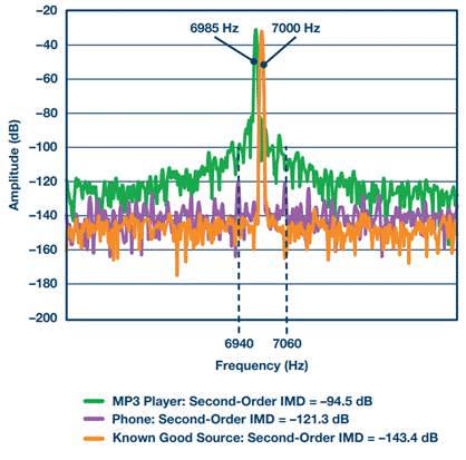 圖3顯示了從已知良好源(橙色)到劣質MP3播放器(綠色)的各種設備的IMD范圍。對于MP3和手機,IMD產物在7