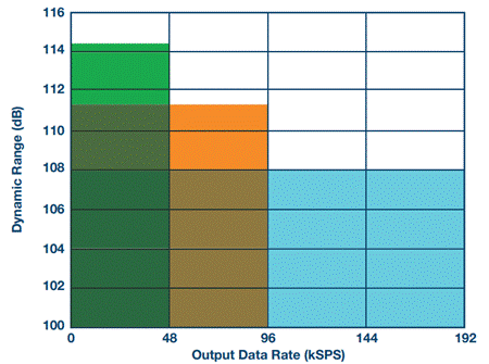kSPS。根據應用需要,通過調整主時鐘 (MCLK) 和/或抽取率,可以將此ODR調諧到48 kSPS、96 kSPS或192