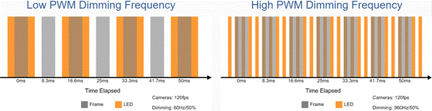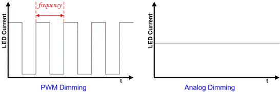 在PWM dimming狀態(tài)下,LED亮度會(huì)有”亮“、”暗”兩個(gè)狀態(tài),不同PWM duty下可以呈現(xiàn)出不同的亮度,當(dāng)PWM dimming的頻率過(guò)低的時(shí)候會(huì)出現(xiàn)頻閃(Flicker)問(wèn)題。采用analog dimming的話LED會(huì)恒亮,在dimming過(guò)程中IC只會(huì)改變輸出電流值,LED亮度也會(huì)跟著改變,不會(huì)有頻閃(Flicker)問(wèn)題。