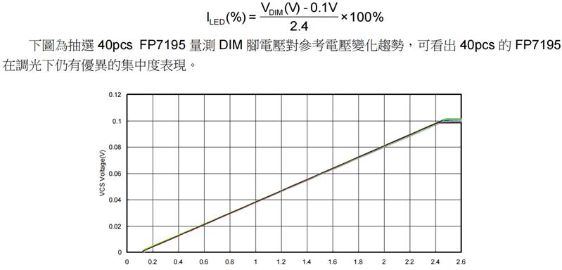 模擬調(diào)光 FP7195 同時(shí)也支援模擬調(diào)光(DC 調(diào)光),只要在 DIM 腳輸入 0.1~2.5V,即可控制輸出電流 0.1%~100%(參考電壓 0.1mV~100mV)。DIM 腳電壓(VDIM)與電流百分比(ILED(%))換算式如下: