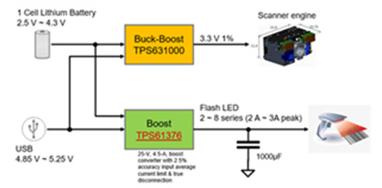 那么,升壓轉換器TPS61376是如何助力更高集成度條碼掃描器方案的呢?條碼掃描器通常會帶有大功率Flash LED用來做光線發射,它的瞬時電流是比較大的,根據用的LED數量不同一般2~3A甚至更大。而條碼掃描器的電源是USB或者電池,尤其是USB接口是承受不了這樣的瞬時大電流,所以通常在系統中加入一個緩沖電容,由這個緩沖電容來提供瞬時能量,此外,系統中還會在USB電源供電測加入限流保護,避免瞬時大電流將USB電源拉死。同時,電路中需要升壓電路將條碼掃描器的輸入升壓給Flash LED供電。下圖為條碼掃描器系統框圖。