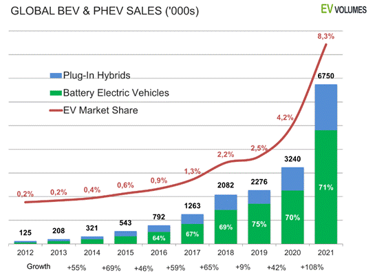 圖1:2012-2021全球新能源汽車市場趨勢(圖源:EV Volumes)