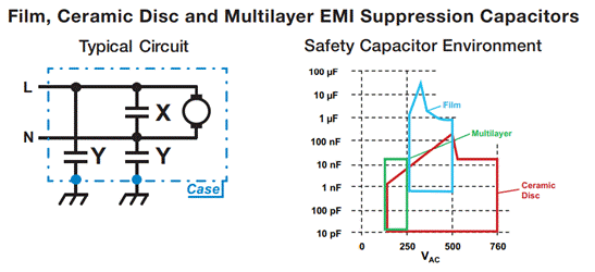 圖6:薄膜、陶瓷片和多層EMI抑制電容器典型電路及安規電容器圖(圖源:Vishay)