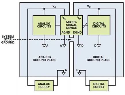 這樣就基本在混合信號器件上產生了系統“星型”接地。所有高噪聲數字電流通過數字電源流入數字接地層,再返回數字電源;與電路板敏感的模擬部分隔離開。系統星型接地結構出現在混合信號器件中模擬和數字接地層連接在一起的位置。