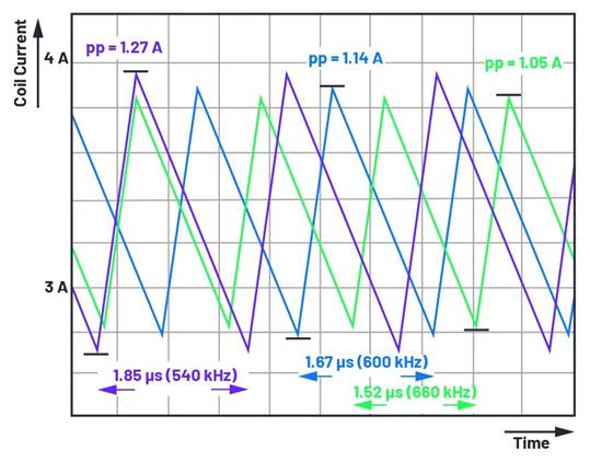 圖 2. 受開關(guān)頻率變化影響的峰到峰線圈電流紋波