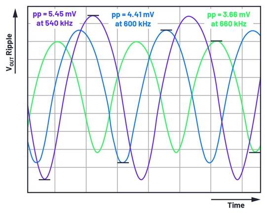 圖 3. 在開關(guān)模式穩(wěn)壓器 IC 中,開關(guān)頻率變化導(dǎo)致的輸出電壓紋波變化