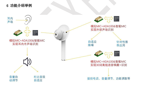 將麥克風的模擬mic與ADA100相結合可以對于耳內的聲場進行識別,從而實現音量和音效的自適應調節;對于外部聲場也能進行識別,從而做出自適應降噪,降低降噪消耗的功耗,提升續航時間;ADA100還擁有30個關鍵詞的識別,可以通過語音控制來進行電話的接掛、音量大小的調控、音樂的切換等人機交互功能,更加的快速便捷。