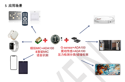 ADA100搭配麥克風可以應用到許多智能設備上,例如TWS耳機、智能手環、手機和平板電腦的人工智能助手、智能遙控器、智能開關、智能家居等,使用場景相當廣泛。