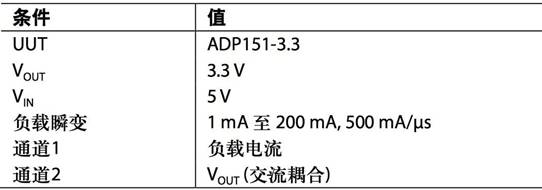 因為LDO控制環(huán)路的帶寬有限,因此輸出電容必須提供快速瞬變所需的大多數(shù)負載電流。1μF電容無法持續(xù)很長時間供應電流并產生約80mV的負載瞬變。10μF電容將負載瞬變降低至約70mV。將輸出電容提高至20μF,LDO控制回路就可捕捉并主動降低負載瞬變。測試條件如表1所示。