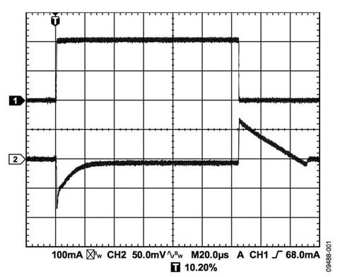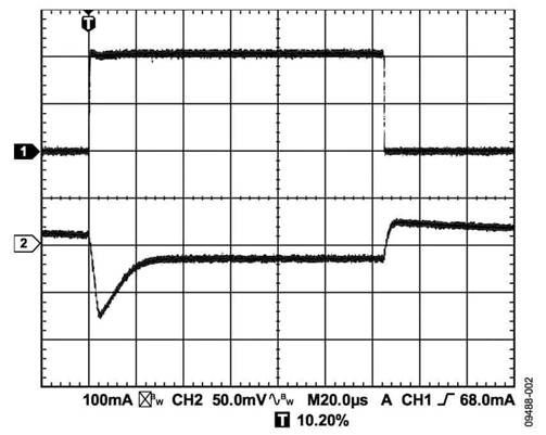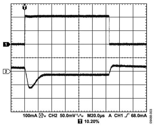 輸出電容還會影響負載電流變化的瞬態(tài)響應。采用較大的輸出電容值可以改善LDO對大負載電流變化的瞬態(tài)響應。圖1至3所示為輸出電容值分別為1μF、10μF和20μF的ADP151的瞬態(tài)響應。
