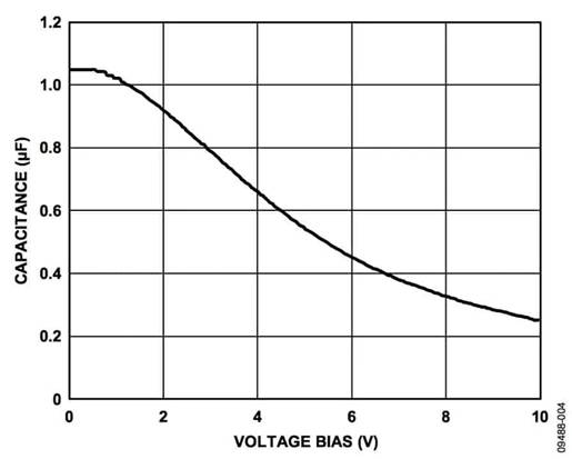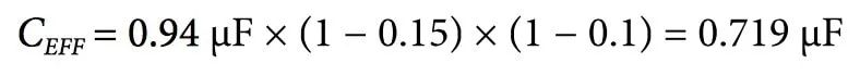 本例中,假定X5R電介質在−40°C至+85°C范圍內的最差情況電容(TVAR)為0.15(15%)。假設電容容差(TOL)為0.10(10%), CBIAS在1.8 V時為0.94μF,如圖4所示。