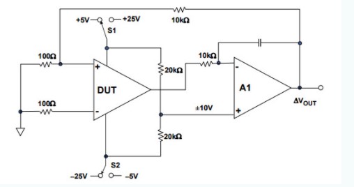 與上述電路相比,以下電路更為復雜,無需使用精密電阻即可測量CMRR。通過切換電源電壓來改變共模抑制比。實際上,該電路可以很容易地實現,并且通過使用相同的電路,可以應用不同的電源電壓來測量電源抑制比。