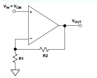CMRR可以在配置在同相放大器中的運算放大器中建立并聯失調電壓,如下圖所示。同相運算放大器會有少量CMRR誤差,因為兩個輸入都接地,不存在CM動態電壓。