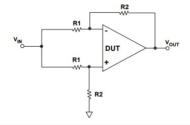 有不同的方法來測量共模抑制比。在下圖中,小編將運算放大器配置為差分放大器的四個精密電阻。一個信號應用于兩個輸入,測量輸出的變化,一個具有無限CMRR的放大器也沒有輸出變化。