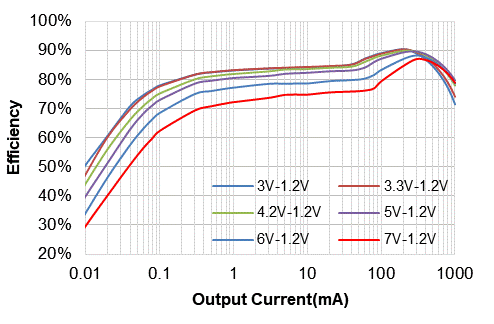• 支持最大1A的輸出電流能力,針對1A以內的各種負載應用情況都可以適用。