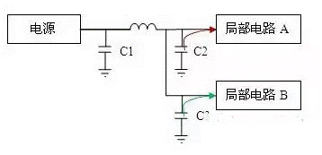 圖中電源為A和B供電。電流經C1后再經過一段PCB走線分開兩路分別供給A和B。當A在某一瞬間需要一個很大的電流時,如果沒有C2和C3,那么會因為線路電感的原因A端的電壓會變低,而B端電壓同樣受A端電壓影響而降低,于是局部電路A的電流變化引起了局部電路B的電源電壓,從而對B電路的信號產生影響。同樣,B的電流變化也會對A形成干擾。這就是“共路耦合干擾”。