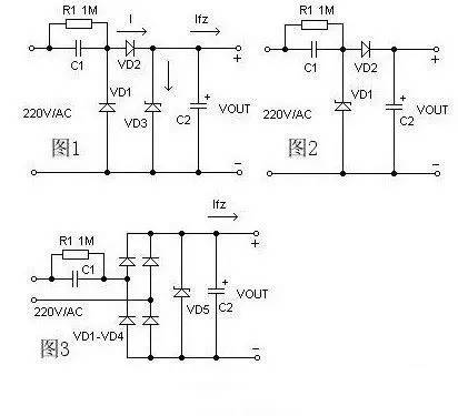 電容降壓式簡易電源的基本電路如圖1,C1為降壓電容器,D2為半波整流二極管,D1在市電的負半周時給C1提供放電回路,D3是穩壓二極管,R1 為關斷電源后C1的電荷泄放電阻。在實際應用時常常采用的是圖2的所示的電路。當需要向負載提供較大的電流時,可采用圖3所示的橋式整流電路。整流后未經穩壓的 直流電壓一般會高于30伏,并且會隨負載電流的變化發生很大的波動,這是因為此類電源內阻很大的緣故所致,故不適合大電流供電的應用場合。