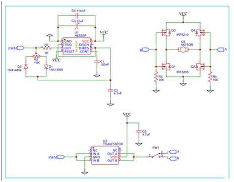 該電路稱為H 橋,因為 MOSFET 形成兩個垂直沖程,電機形成字母“H”的水平沖程。它是解決所有電機驅動問題的簡單而優雅的解決方案。可輕松改變方向,控制速度。