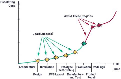 設計從圖紙上看起來可能毫無問題(也就是說,從原理圖角度),甚至在模擬期間也沒有任何問題,但真正的測試其實是在布局、PCB制造,以及通過載入電路實施原型制作應力測試之后。這部分使用真實的設計示例,介紹一些技巧來幫助避開陷阱。我們將介紹幾個重要概念,以幫助避開設計缺陷和其他陷阱,以免未來需要重新設計和/或重新制作PCB。圖1顯示在沒有進行細致測試和余量分析的情況下,在設計進入生產之后會如何造成成本急速上漲。