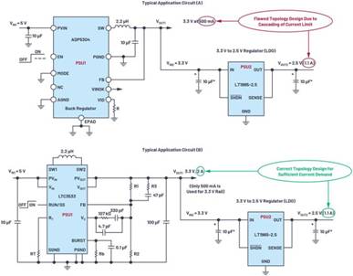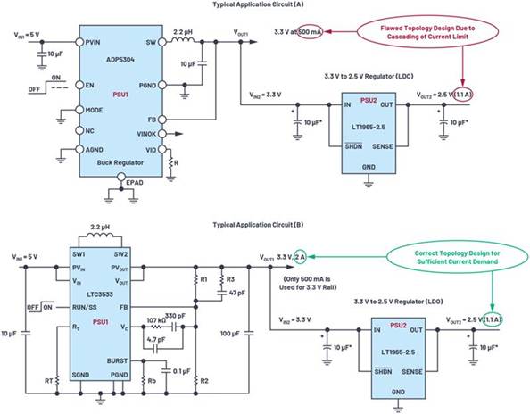 退出級聯階段時,要避免限流情況。圖2所示為一個典型的級聯應用:(A) 顯示由產生3.3 V電源,電流500 mA的ADP5304 降壓 穩壓器(PSU1)構成的設計。為了提高效率,設計人員應分接3.3 V電軌,而不是5 V輸入電源。3.3 V輸出被進一步切斷,以為PSU2 (LT1965)供電,這款LDO穩壓器用于進一步將電壓降低至2.5 V,且按照板載2.5 V電路和IC的要求,將輸出電流限制在1.1 A。