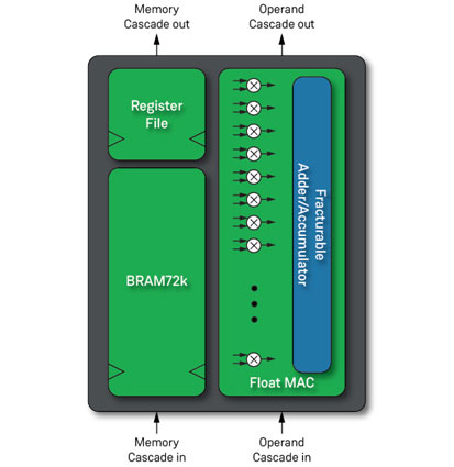 在Speedster7t上搭載的機器學習處理器(MLP)是一種優(yōu)化的矩陣/向量乘法模塊,能夠在單個時鐘周期內(nèi)進行32次乘法和1次累加,是計算引擎架構的基礎。AC7t1500器件中的Block RAM(BRAM)與2560個MLP實例都處于同一位置,這意味著更低的延遲和更高的吞吐量。