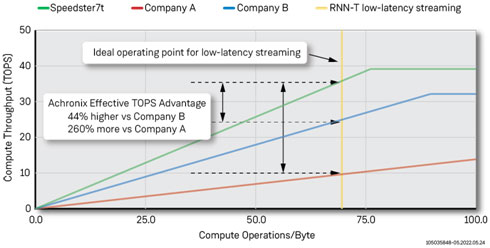 下圖顯示了一個有效TOPS的roofline模型,它使用了Achronix為微基準(GEMV和MLP)和測試而構建的子集,以及公司A [4] [5]和公司B(基于架構)發(fā)布的數(shù)據(jù)。橙色的豎線表示批處理量為8毫秒和80毫秒音頻模塊的最佳操作點,用于低延遲、實時ASR數(shù)據(jù)流應用。在這個最佳操作點上,Achronix的有效TOPS比公司A提高了44%,比公司B的解決方案提高了260%。