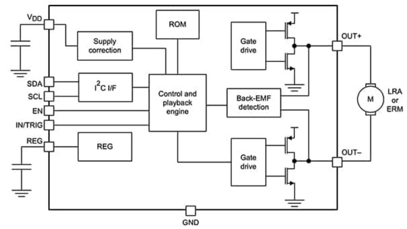 圖 4:DRV2605L IC 可以驅動 LRA 或 ERM 觸感器件。(圖片來源:Texas Instruments)
