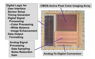 典型的CMOS成像系統包含有源像素顏色陣列、模擬信號處理電路、模數轉換器和用于控制接口、時序和數據讀取的數字部分。陣列的填充因數是感光部分相對于傳感器總尺寸的百分比。光電探測器是一種光敏傳感器,用于捕獲可見光子并將其轉換為電流(毫微微安級)。