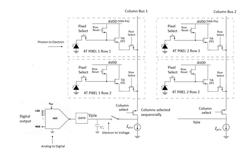 現有多種不同的像素晶體管設計,包括三晶體管(3T)、四晶體管(4T)和五晶體管(5T)版本。在4T布局中,光電二極管將接收到的可見光子轉換為電荷。每個電壓一次讀取一行并放入柱狀電容器(C)中。然后使用解碼器和多路復用器進行讀取。
